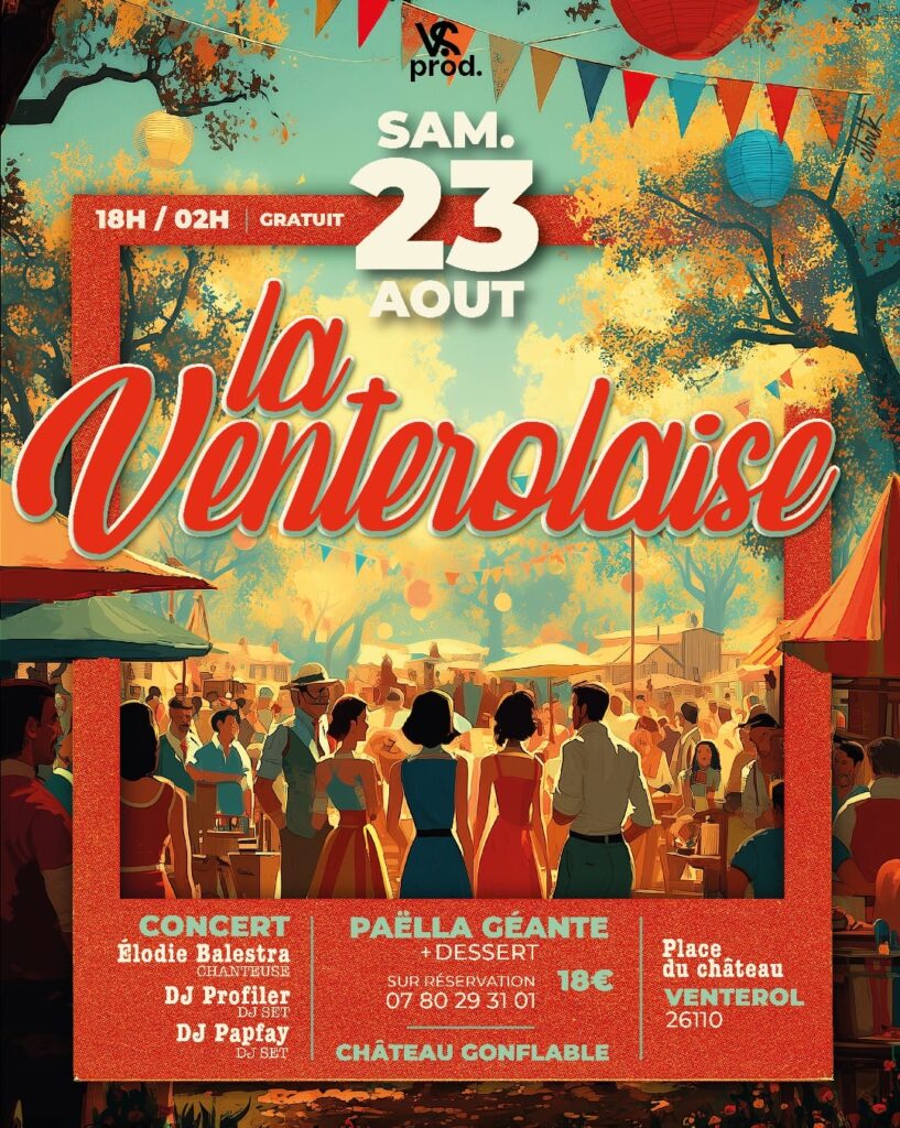 La fête votive renaît ! Après quelques années de silence, elle fait peau neuve pour son grand retour : La Venterolaise vous donne rendez-vous le samedi 23 août, sur la place du Château, pour une soirée festive et chaleureuse à vivre tous ensemble, de 18h à 2h du matin.