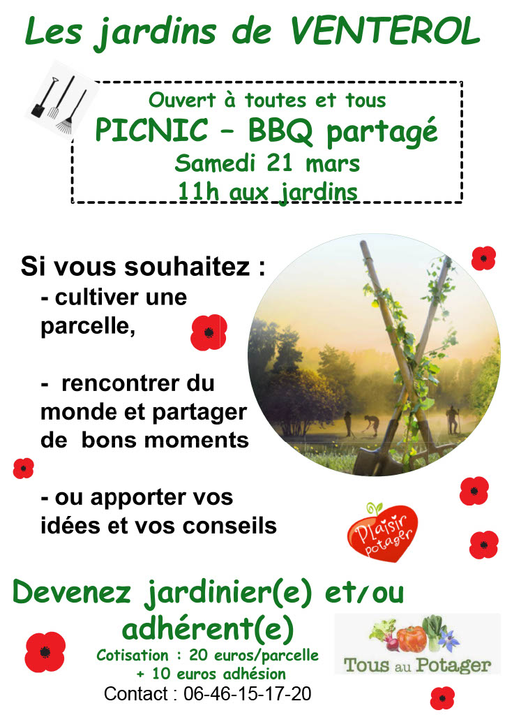 L’association des jardins familiaux de Venterol entre dans sa 5ème année. A cette occasion, venez nous accompagner lors du picnic / BBQ partagé le samedi 21 mars à partir de 11h aux jardins partagés. Un moment de rencontre et de convivialité pour tout le monde. A la bonne franquette, chacun partage ses plats et boissons (n’oubliez pas vos couverts, nappe voire chaises). Attention pas de stationnement aux jardins.
