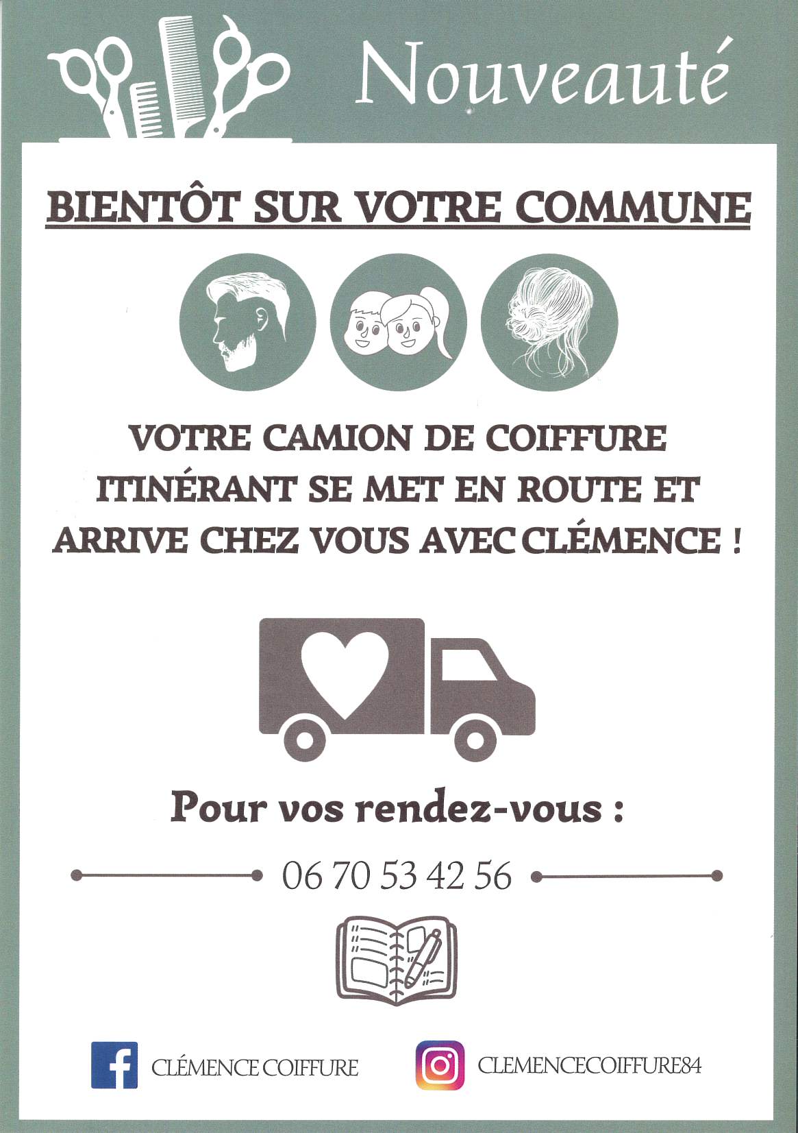Clémence arrive bientôt avec son camion de coiffure, devant la Mairie, pour vous proposer ses services. Voici ses premières dates : vendredi 5 juillet au matin, mardi 20 août au matin. Des venues régulières seront programmées dès septembre. Pour vos rendez-vous : 06