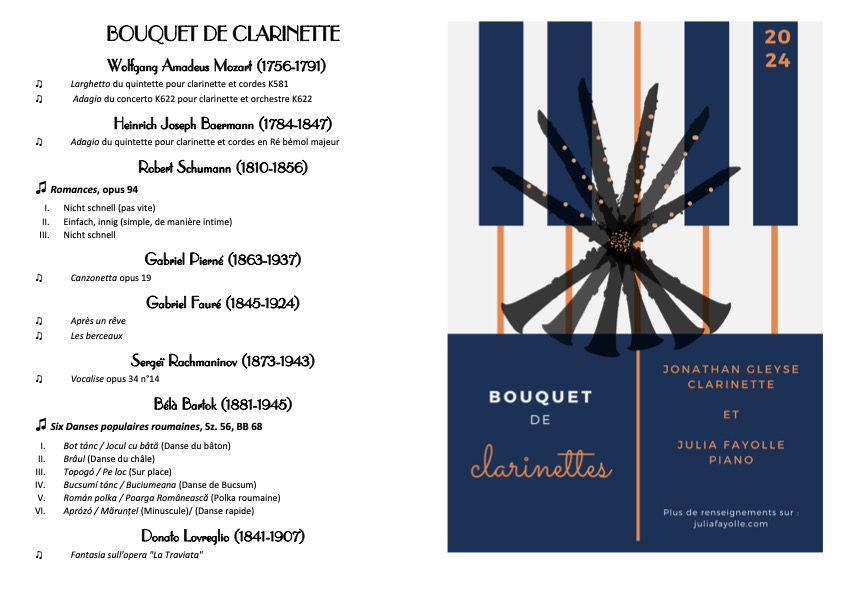 Dans le cadre de l'exposition de Monika Riethmueller, jusqu'au 26 octobre, la galerie Ombre et Lumière propose un concert de musique classique BOUQUET DE CLARINETTES Samedi 28 septembre à 17h avec Jonathan Cleyse (clarinette) et Julia Fayolle (piano) gratuit Programme en PJ.